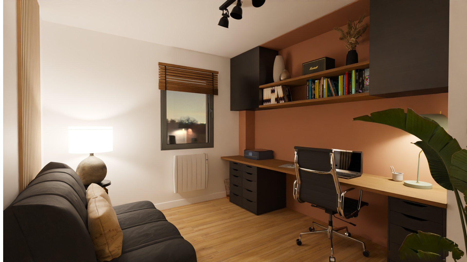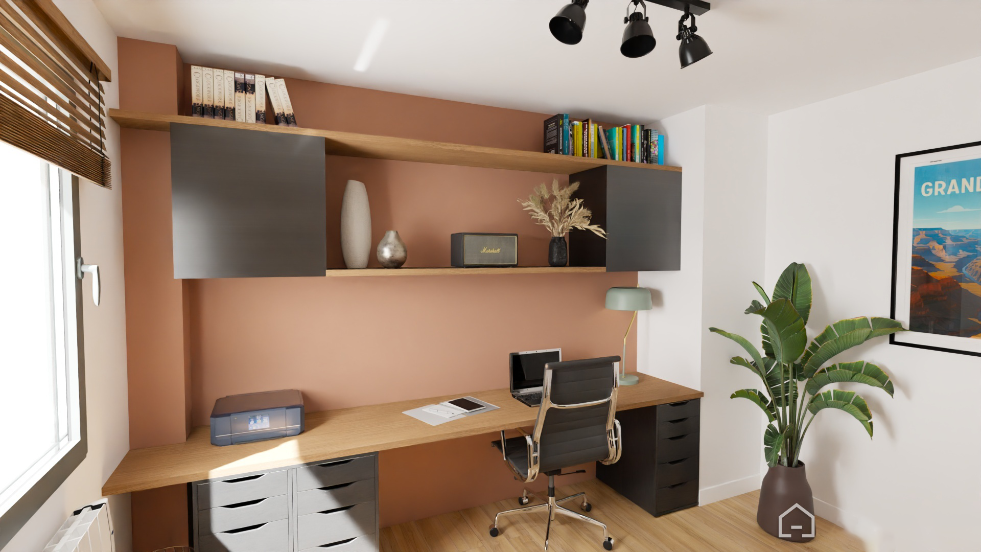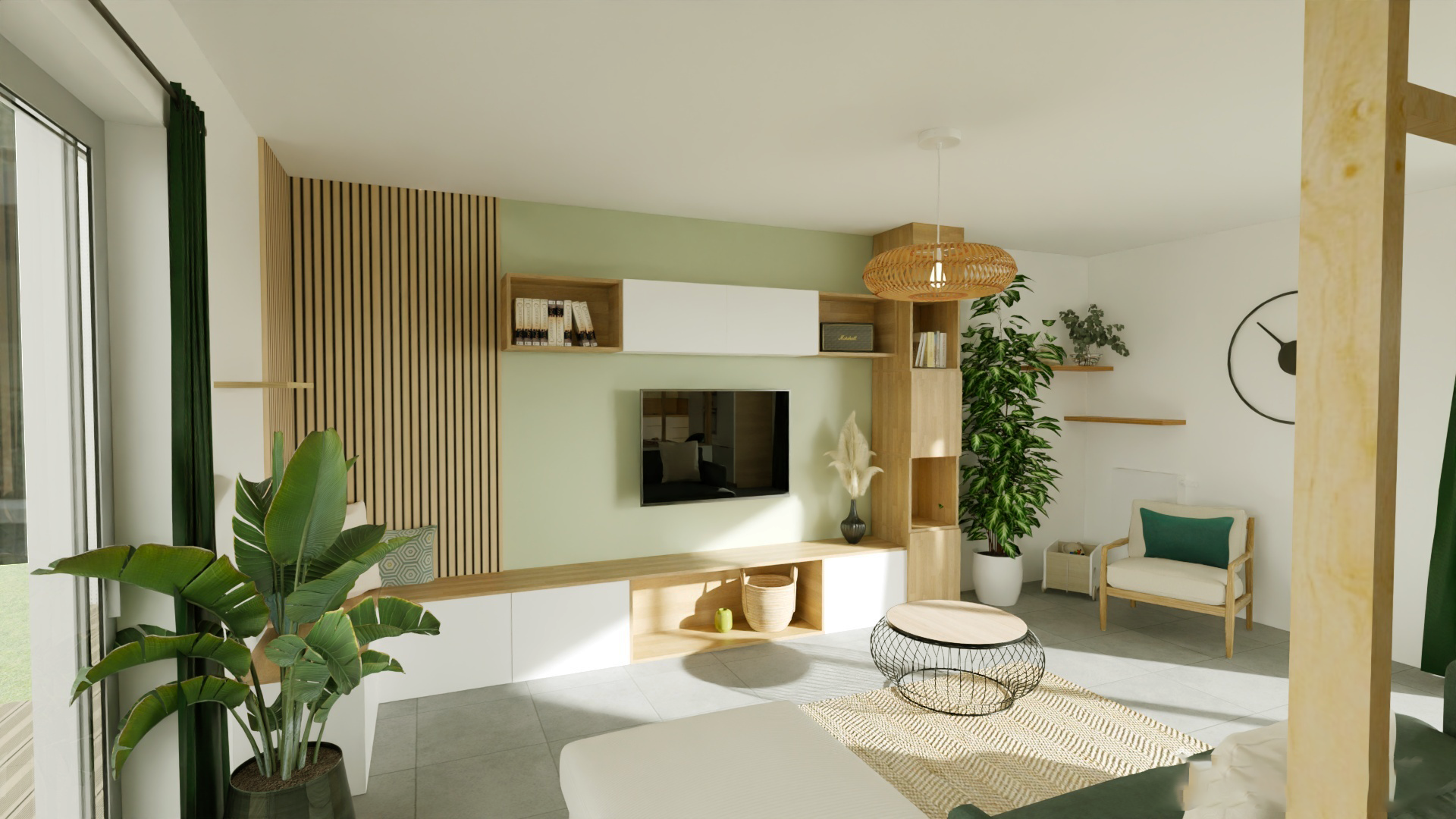 RENDUS : Plan d’agencement 2D, modélisations 3D, planche mobilier, rendus HD et liste d’achats. Dossier technique avec plans d’élévation pour l’aménagement sur-mesure. Chiffrage artisan pour meuble TV / Claustra